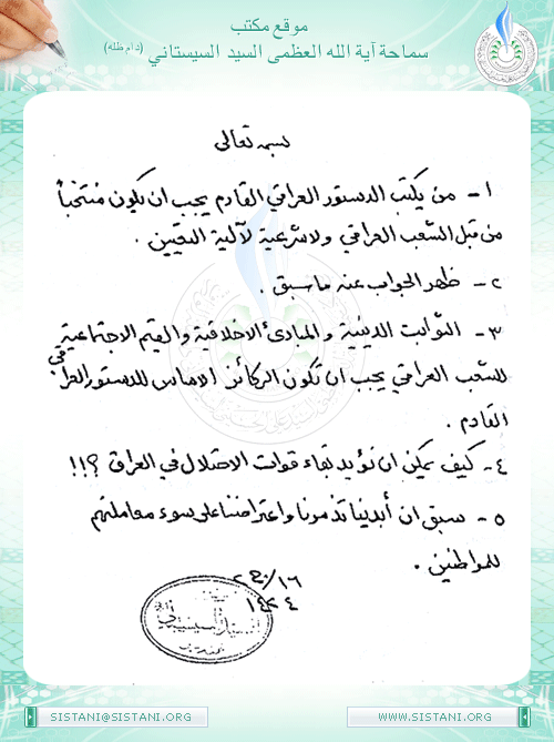 ج1: من يكتب الدستور العراقي القادم يجب أن يكون منتخباً من قبل الشعب العراقي ولا شرعية لآلية التعيين.