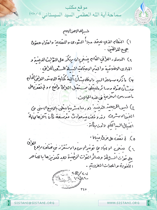 ج2: الدستور العراقي القادم ينبغي أن يرتكز على الثوابت الدينية و المبادئ الأخلاقية والقيم الاجتماعية النبيلة للشعب العراقي.