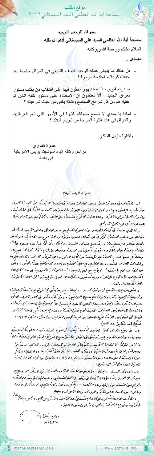 3- إن سماحة السيد – دام ظله – على الرغم من اهتمامه البالغ ومتابعته المستمرة للشأن العراقي في جميع جوانبه إلاّ أنه قد دأب على عدم التدخل في تفاصيل العمل السياسي وفسح المجال لمن يثق بهم الشعب العراقي من السياسيين لممارسة هذه المهمة ، ويكتفي سماحته بابداء النصح والارشاد لمن يزوره ويلتقي به من أعضاء مجلس الحكم والوزراء وزعماء الأحزاب وغيرهم .