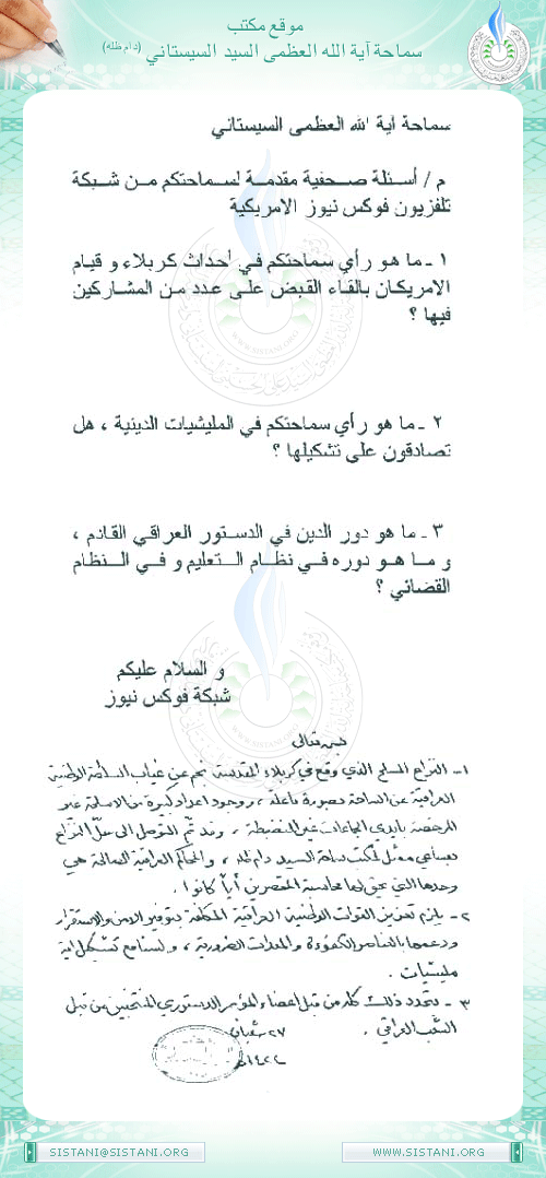 م/ أسئلة صحفية مقدمة لسماحتكم من شبكة تلفزيون فوكس نيوز الامريكية