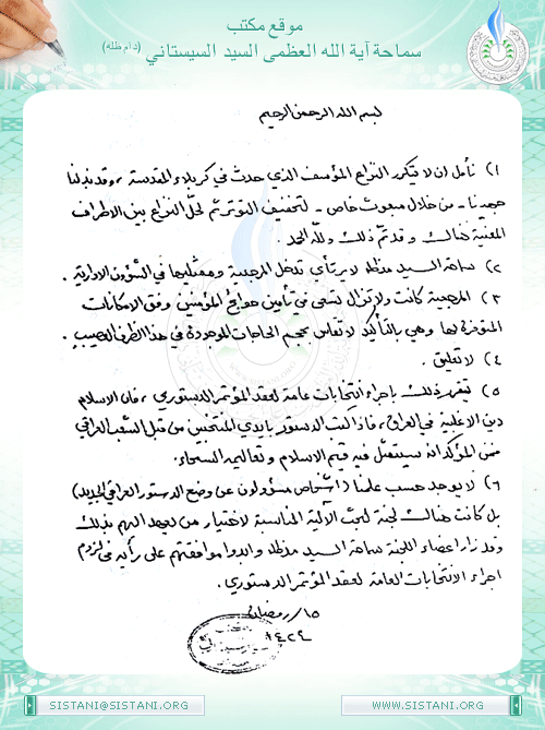 ج5: يتقرر ذلك بإجراء انتخابات عامة لعقد المؤتمر الدستوري، فإن الإسلام دين الأغلبية في العراق، فإذا كتب الدستور بأيدي المنتخبين من قبل الشعب العراقي فمن المؤكد أنّه سيتمثل فيه قيم الإسلام وتعاليمه السمحاء.
