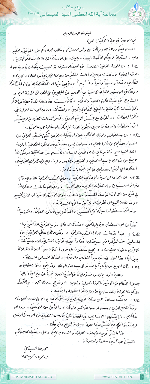 ج2: إنّ سماحة السيد دام ظله إنّما طالب بإجراء الانتخابات لغرض تمكين الشعب العراقي من اختيار ممثليهم من إدارة بلدهم، سماحته ليس معنياً بتصدي الحوزة العلمية لممارسة العمل السياسي فإنّه يرتأي لعلماء الدين أن ينأوا بأنفسهم عن هذا المجال، ولكن هذا لا يمنع من قيامهم بإسداء النصح والتوجيه للناس وإرشادهم إلى الضوابط التي ينبغي اعتمادها في اختيار ممثليهم في أية انتخابات قادمة.