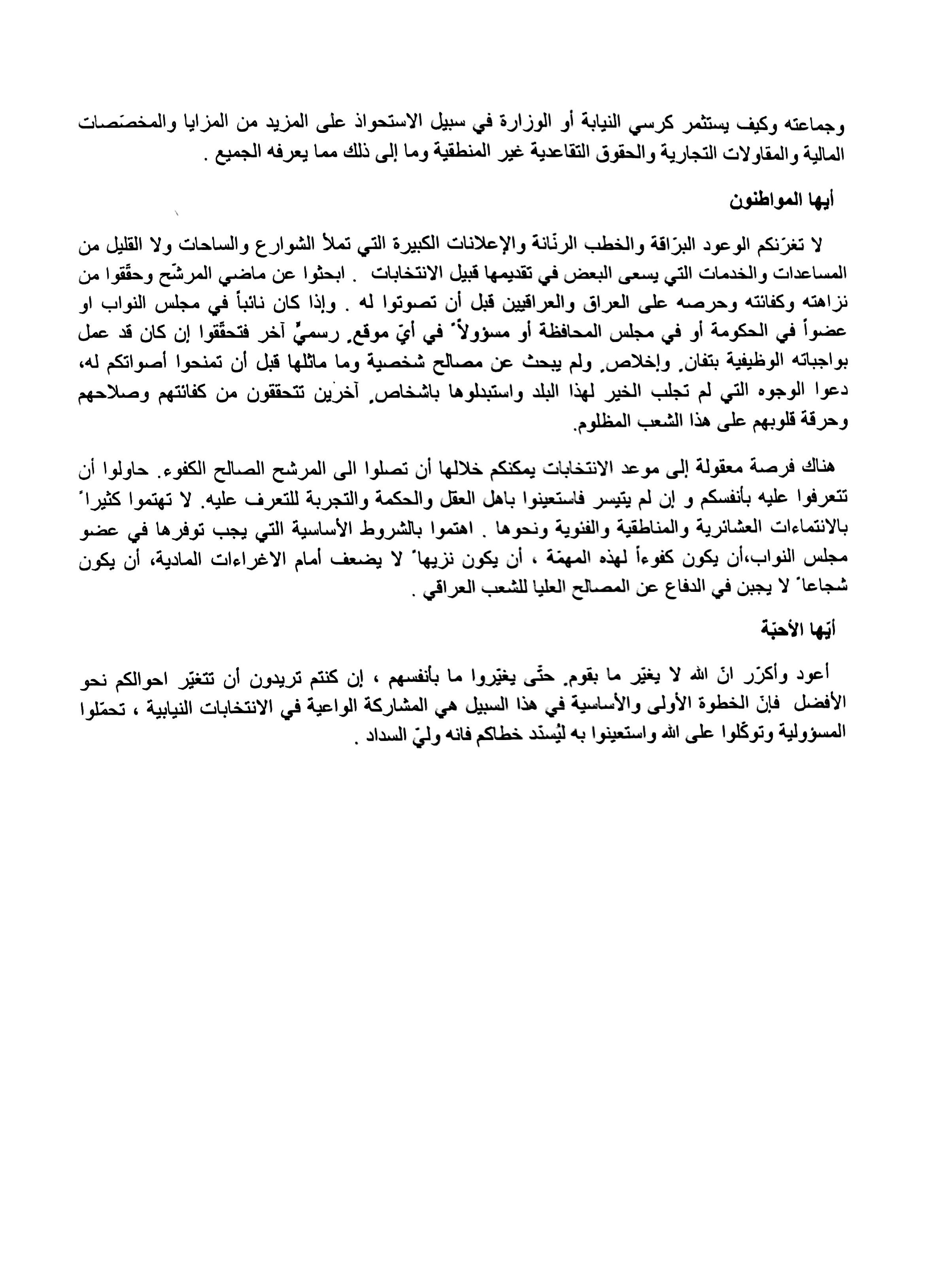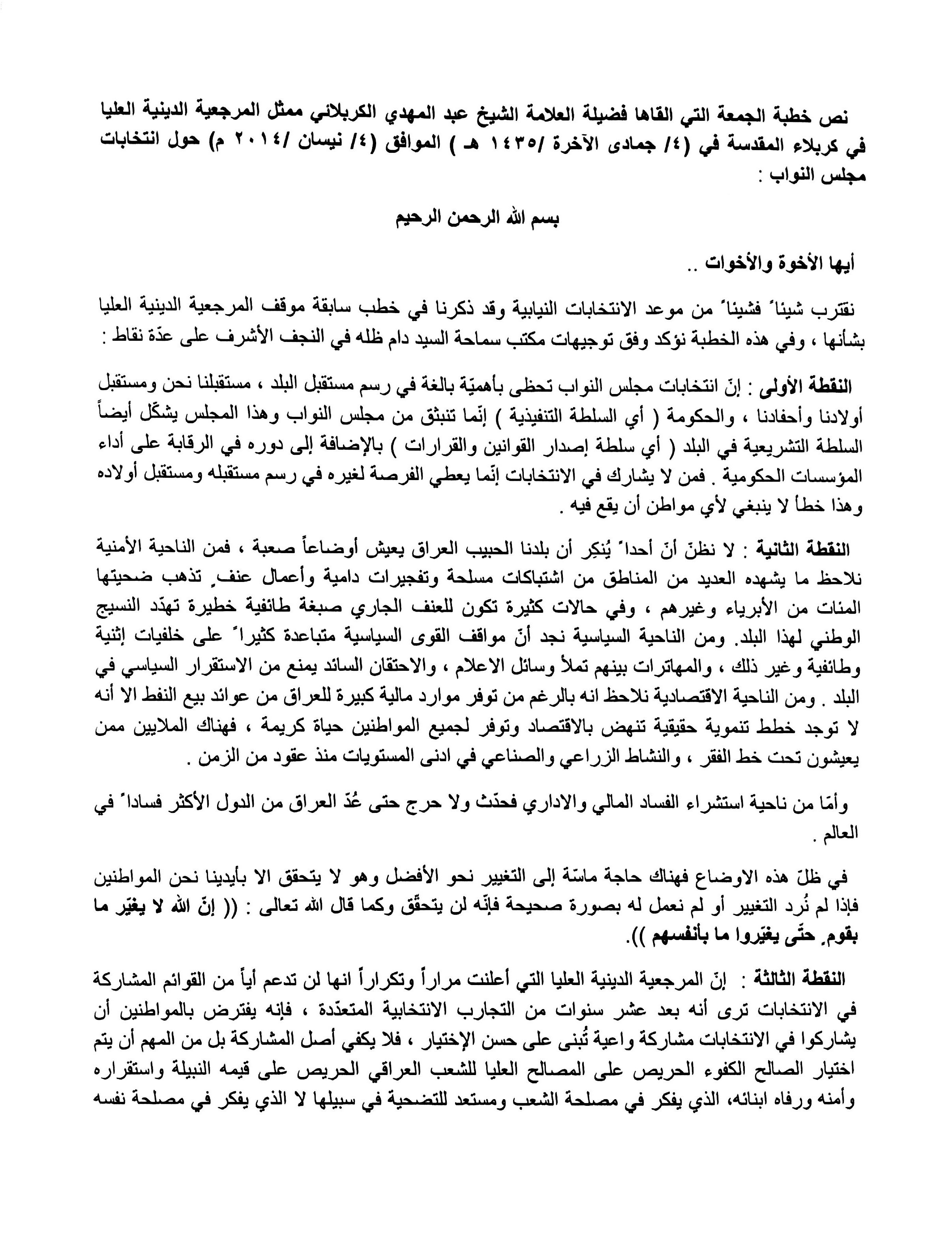 نص خطبة الجمعة التي القاها فضيلة العلامة الشيخ عبد المهدي الكربلائي ممثل المرجعية الدينية العليا في كربلاء المقدسة في (4/ جمادى الآخرة/1435هـ) الموافق(4/4/2014)(حول انتخابات مجلس النواب)