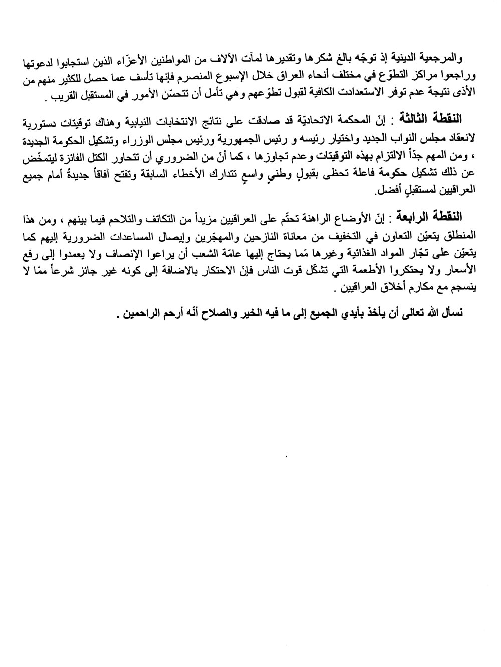 النقطة الثالثة : إنّ المحكمة الاتحاديّة قد صادقت على نتائج الانتخابات النيابية وهناك توقيتات دستورية لانعقاد مجلس النواب الجديد واختيار رئيسه و رئيس الجمهورية ورئيس مجلس الوزراء وتشكيل الحكومة الجديدة ، ومن المهم جدّاً الالتزام بهذه التوقيتات وعدم تجاوزها ، كما أنّ من الضروري أن تتحاور الكتل الفائزة ليتمخّض عن ذلك تشكيل حكومة فاعلة تحظى بقبولٍ وطنيٍ واسعٍ تتدارك الأخطاء السابقة وتفتح آفاقاً جديدةً أمام جميع العراقيين لمستقبلٍ أفضل.