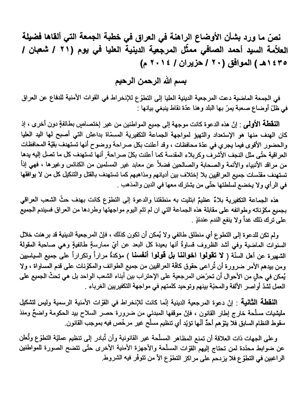 النقطة الأولى : إنّ هذه الدعوة كانت موجهة إلى جميع المواطنين من غير إختصاصٍ بطائفةٍ دون أخرى ، إذ كان الهدف منها هو الإستعداد والتهيؤ لمواجهة الجماعة التكفيرية المسمّاة بداعش التي أصبح لها اليد العليا والحضور الأقوى فيما يجري في عدّة محافظات ، وقد أعلنت بكل صراحة ووضوح أنها تستهدف بقيّة المحافظات العراقية حتّى مثل النجف الأشرف وكربلاء المقدسة كما أعلنت بكلّ صراحة ٍ أنها تستهدف كل ما تصل إليه يدها من مراقد الأنبياء والأئمة والصحابة والصالحين فضلاً عن معابد غير المسلمين من الكنائس وغيرها ، فهي إذاً تستهدف مقدّسات جميع العراقيين بلا إختلاف بين أديانهم ومذاهبهم كما تستهدف بالقتل والتنكيل كل من لا يوافقها في الرأي ولا يخضع لسلطتها حتّى من يشترك معها في الدين والمذهب .