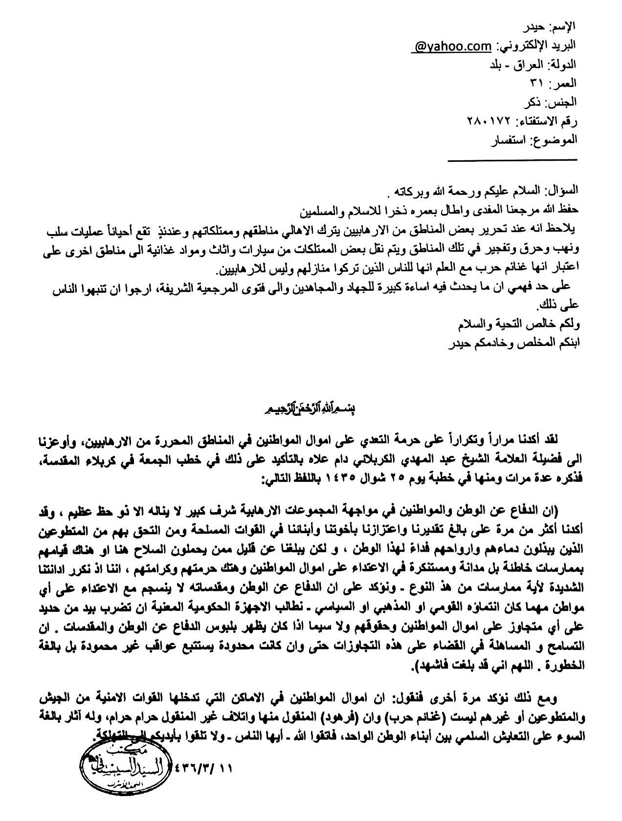 ما ورد في خطبة الجمعة لممثل المرجعية الدينية العليا في كربلاء المقدسة فضيلة العلاّمة الشيخ عبد المهدي الكربلائي في (14/ شعبان /1435هـ) الموافق ( 13/6/2014م ) بعد سيطرة (داعش) على مناطق واسعة في محافظتي نينوى وصلاح الدين وإعلانها أنها تستهدف بقية المحافظات