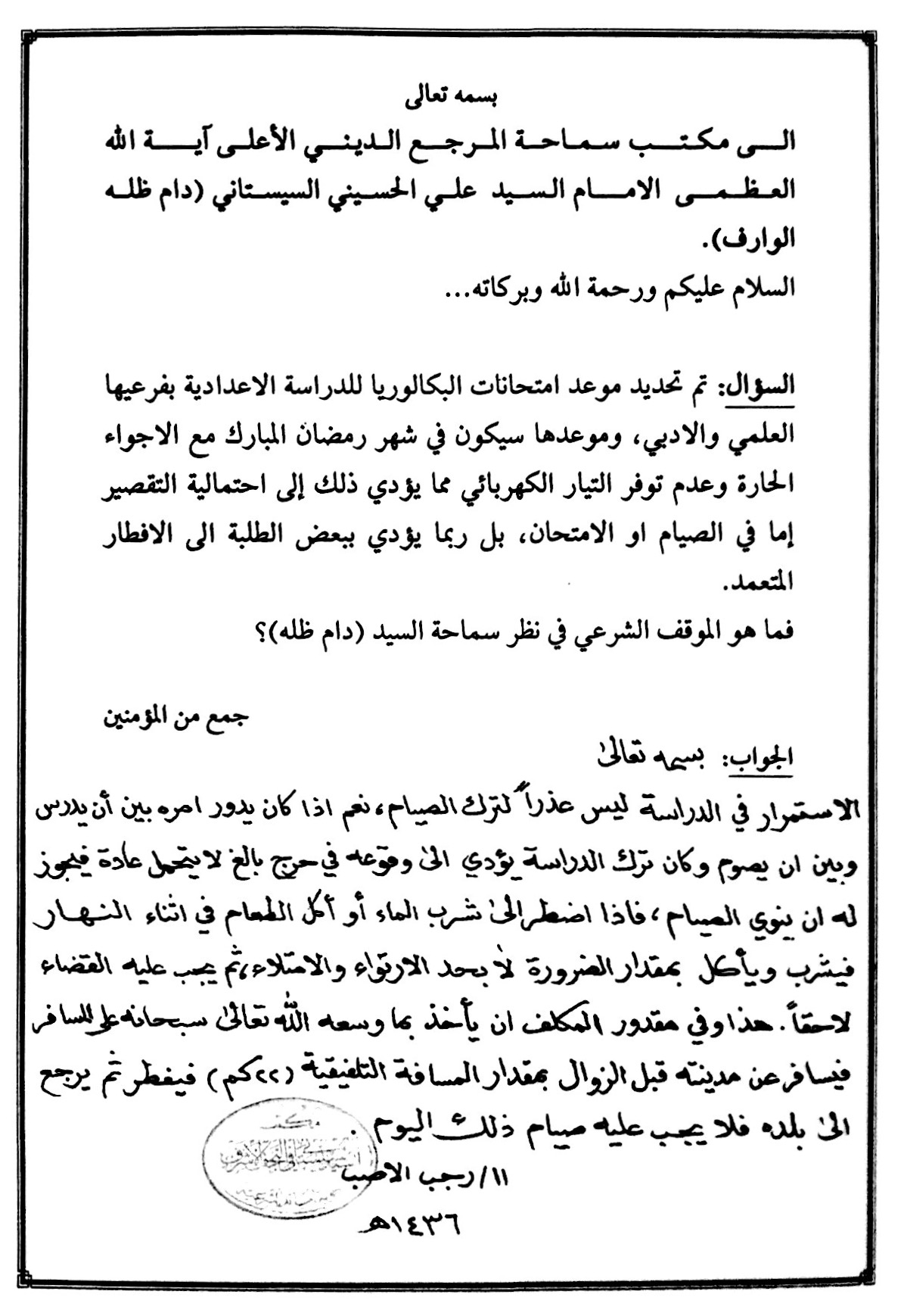 السؤال : تم تحديد موعد امتحانات البكالوريا للدراسة الاعدادية بفرعيها العلمي والأدبي ، وموعدها سيكون في شهر رمضان المبارك مع الأجواء الحارة وعدم توفر التيار الكهربائي مما يؤدي ذلك إلى إحتمالية التقصير إما في الصيام أو الامتحان ، بل ربما يؤدّي ببعض الطلبة إلى الافطار المتعمد.