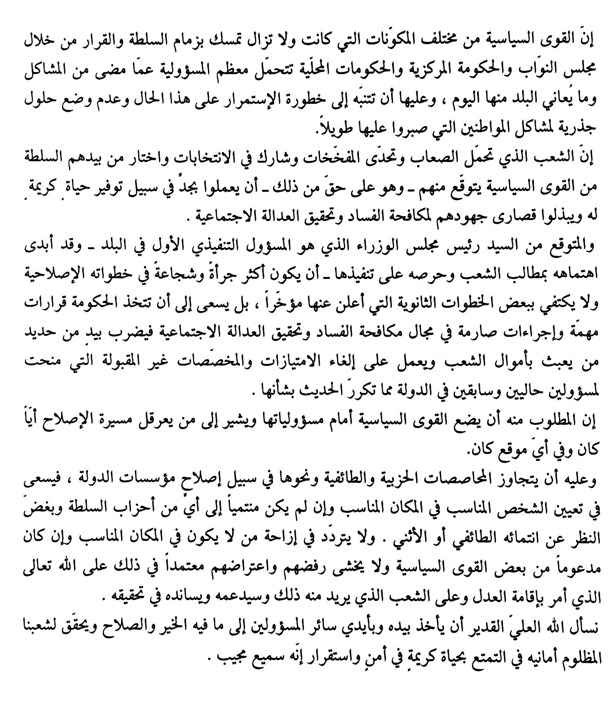 نص ما ورد بشأن الأوضاع الراهنة في العراق في خطبة الجمعة لممثّل المرجعية الدينية العليا السيد أحمد الصافي في ( 21/ شوال /1436 هـ ) الموافق (7/آب/2015