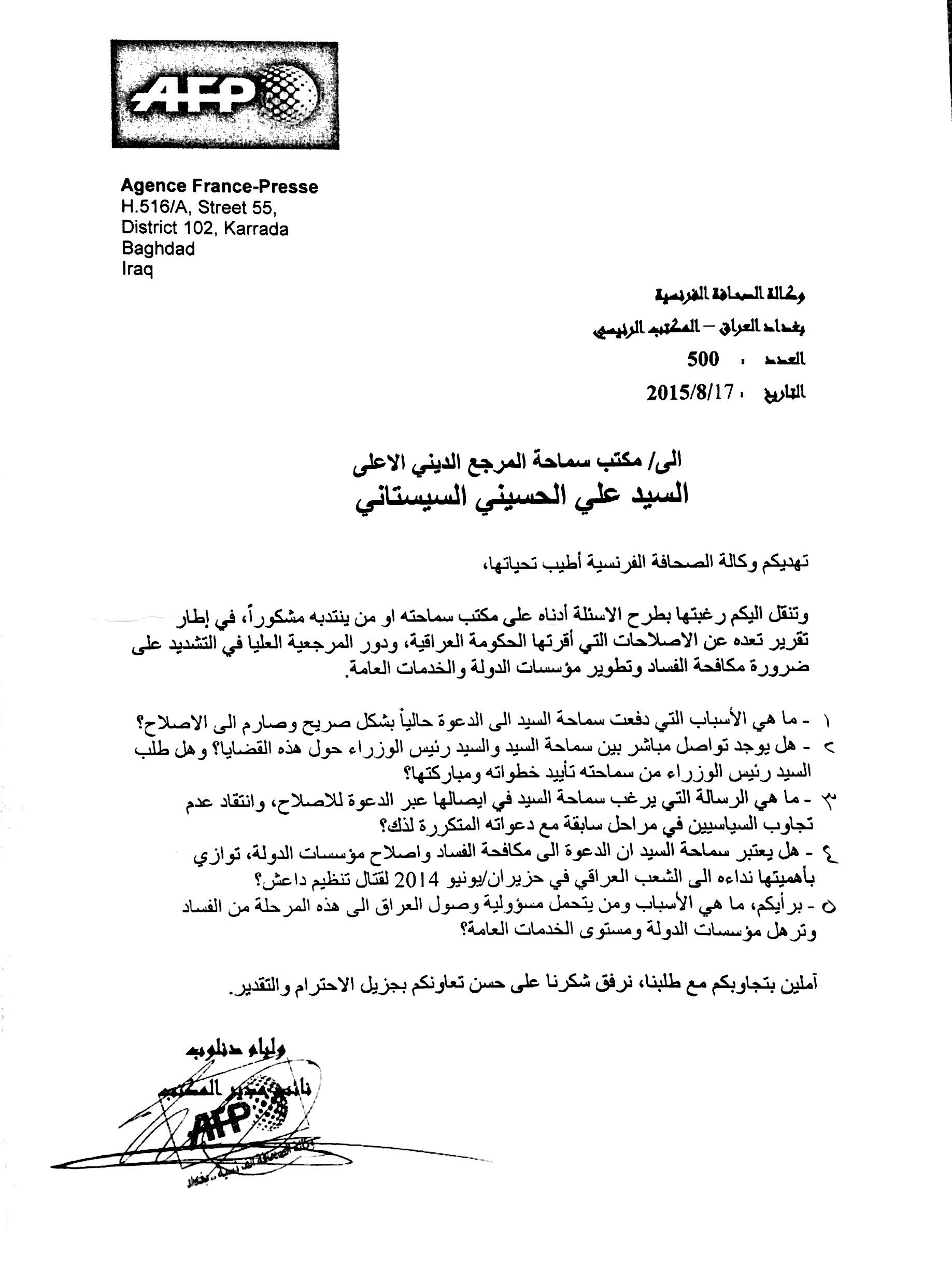 تهديكم وكالة الصحافة الفرنسية أطيب تحياتها ، وتنقل إليكم رغبتها بطرح الأسئلة أدناه على مكتب سماحته أو من ينتدبه مشكوراً ، في إطار تقرير تُعدّه عن الاصلاحات التي أقرّتها الحكومة العراقية ، ودور المرجعية العليا في التشديد على ضرورة مكافحة الفساد وتطوير مؤسسات الدولة والخدمات العامّة .