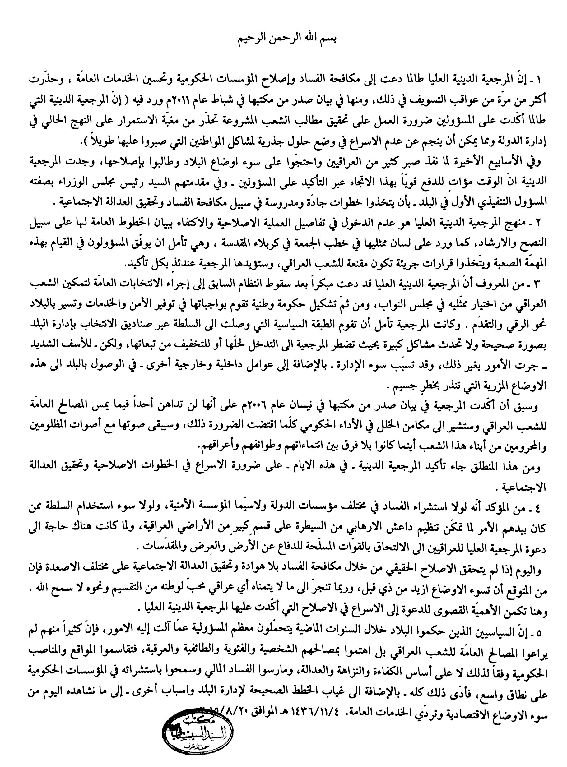 5 ـ إنّ السياسيين الذين حكموا البلاد خلال السنوات الماضية يتحمّلون معظم المسؤولية عمّا آلت إليه الامور، فإنّ كثيراً منهم لم يراعوا المصالح العامّة للشعب العراقي بل اهتموا بمصالحهم الشخصية والفئوية والطائفية والعرقية، فتقاسموا المواقع والمناصب الحكومية وفقاً لذلك لا على أساس الكفاءة والنزاهة والعدالة، ومارسوا الفساد المالي وسمحوا باستشرائه في المؤسسات الحكومية على نطاق واسع، فأدّى ذلك كله ـ بالإضافة الى غياب الخطط الصحيحة لإدارة البلد واسباب أخرى ـ إلى ما نشاهده اليوم من سوء الاوضاع الاقتصادية وتردّي الخدمات العامة. 4/11/1436 هـ الموافق 20/8/2015 م