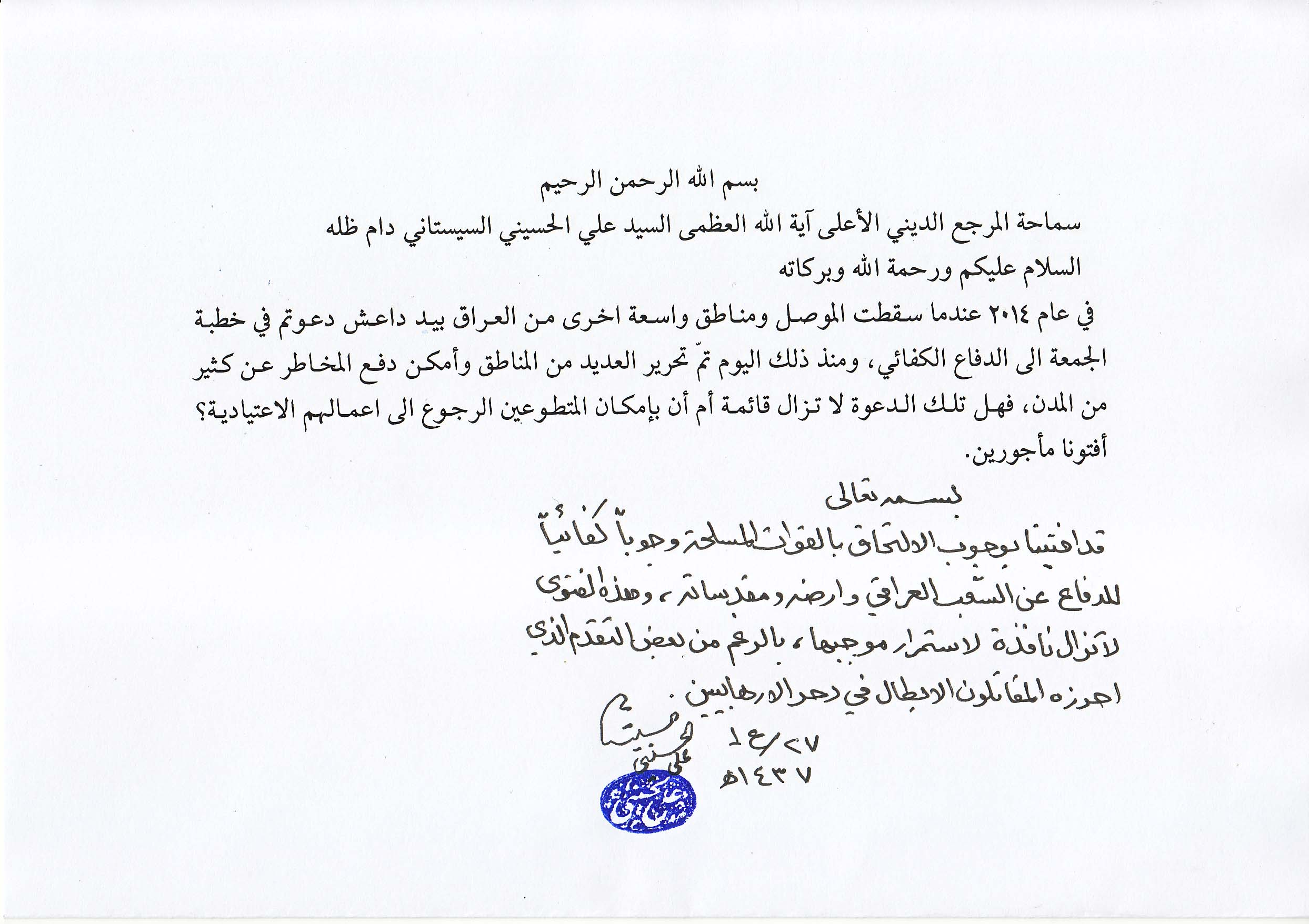 إستفتاء حول استمرار فتوى الدفاع الكفائي إلى حين الانتصار التام على الارهابيين
