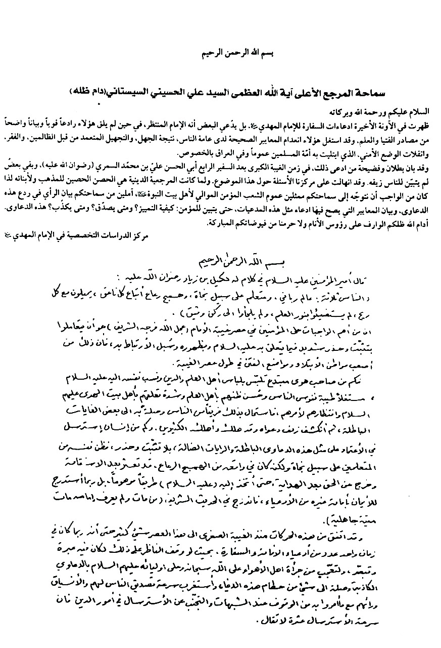 وقد بان بطلان وفضيحة من ادعى ذلك في زمن الغيبة الكبرى بعد السفير الرابع أبي الحسن علي بن محمد السمري (رضوان الله عليه) وبقي بعض لم يتبيّن للناس زيفه، وقد انهالت على مركزنا الأسئلة حول هذا الموضوع، ولما كانت المرجعية الدينية هي الحصن الحصين للمذهب ولأبنائه لذا كان من الواجب أن نتوجه الى سماحتكم ممثلين عموم الشعب المؤمن الموالي لأهل بيت النبوة (عليهم السلام)، آملين من سماحتكم بيان الرأي في ردع هذه الدعاوى، وبيان المعايير التي يصح فيها أدعاء مثل هذه المدعيات، حتى يتبين للمؤمن: كيفية التمييز؟ ومتى يصدّق؟ ومتى يكذّب؟ هذه الدعاوى.