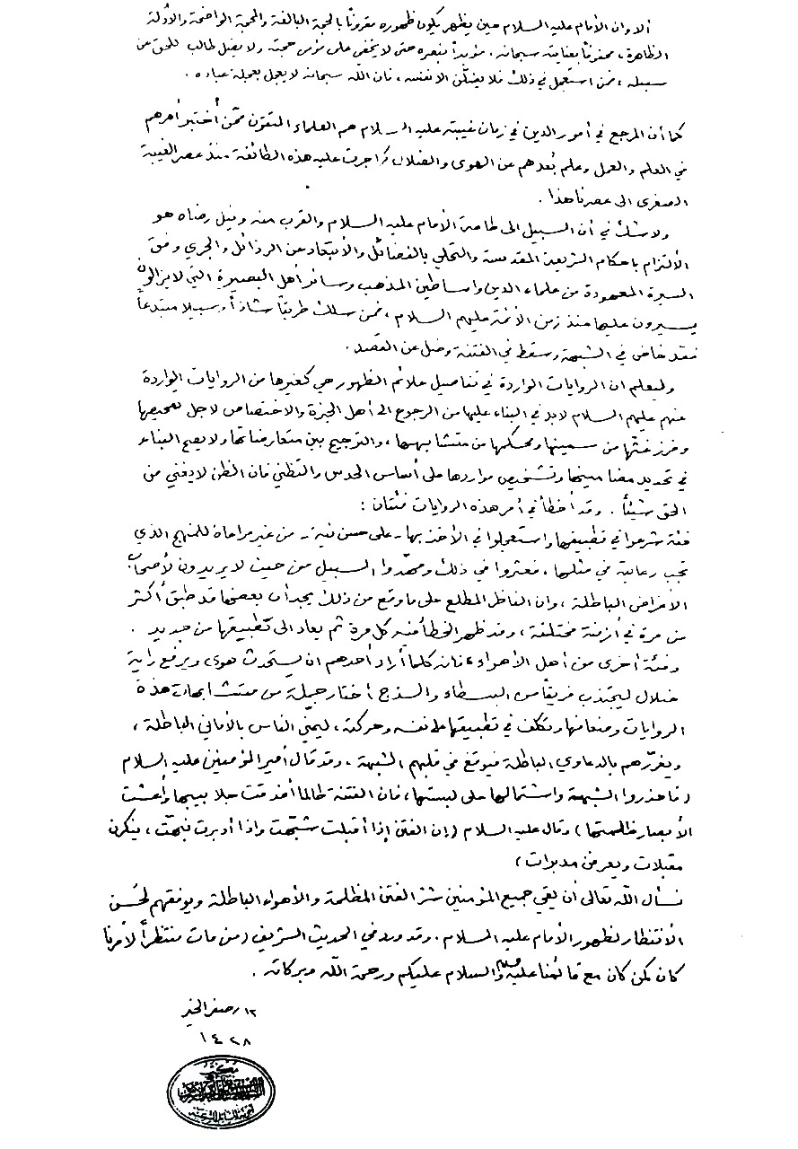 كما أن المرجع في أمور الدين في زمان غيبته عليه السلام هم العلماء المتقون فمن اختبر أمرهم في العلم والعمل وعلم بُعدهم عن الهوى والضلال كما جرت عليه هذه الطائفة منذ عصر الغيبة الصغرى إلى عصرنا هذا.