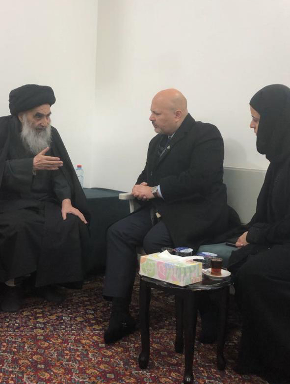 استقبل سماحة السيد السيستاني (دام ظلّه) قبل ظهر اليوم السيد كريم خان المستشار الخاص ورئيس الفريق التابع للأمم المتحدة للتحقيق حول جرائم داعش وجمع الادلة بشأنها، والسيدة نيكول الخوري الخبيرة القانونية في الفريق، ورحّب سماحة السيد بتشكيل هذا الفريق الاممي وأكّد على اهمية توثيق جرائم داعش - كما تم توثيق جرائم النازيين - وضرورة محاسبة مرتكبيها وتعريف العالم بمدى خطورة هذه الفئة الارهابية على الانسانية عامة.