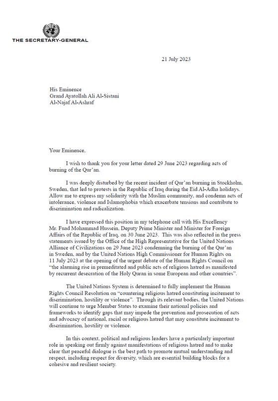 وقد عبرت عن هذا الموقف في اتصالي الهاتفي مع سعادة السيد فؤاد محمد حسين، نائب رئيس مجلس الوزراء ووزير خارجية جمهورية العراق، بتاريخ 30 حزيران 2023. وقد انعكس ذلك أيضاً في البيانات الصحفية الصادرة عن مكتب الممثل السامي لتحالف الأمم المتحدة للحضارات في 29 حزيران 2023 الذي يدين حرق القرآن في السويد، ومفوض الأمم المتحدة السامي لحقوق الإنسان في 11 تموز 2023 في افتتاح المناقشة العاجلة لمجلس حقوق الإنسان حول "الارتفاع المقلق في أعمال الكراهية الدينية المتعمدة والعلنية كما تجلى من خلال التدنيس المتكرر للقرآن الكريم في بعض البلدان الأوروبية وغيرها".