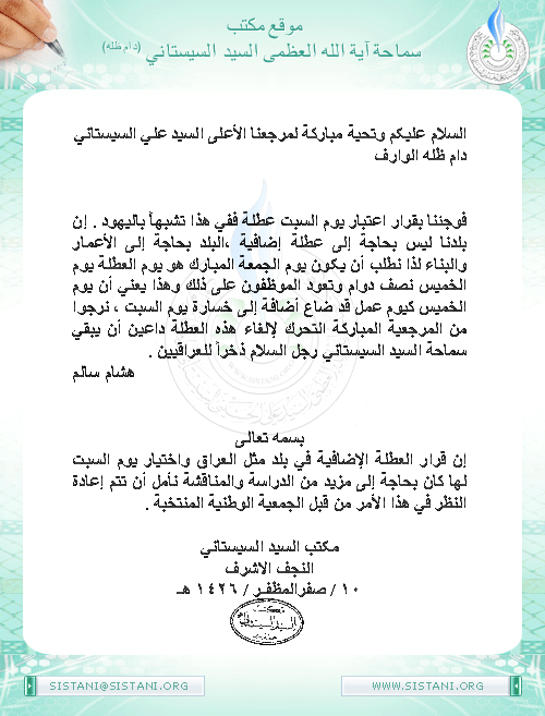 موقع مكتب سماحة المرجع الديني الأعلى السيد علي الحسيني السيستاني (دام ظله)