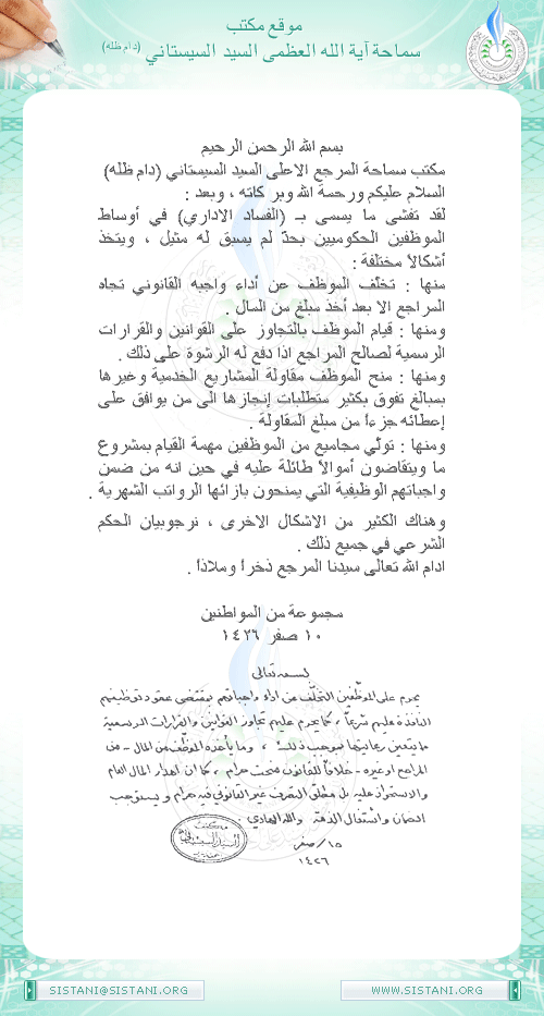 يحرم على الموظّفين التخلّف عن أداء واجباتهم بمقتضى عقود توظيفهم النافذة عليهم شرعاً، كما يحرم عليهم تجاوز القوانين والقرارات الرسمية ممّا يتعين رعايتها بموجب ذلك، وما يأخذه الموظّف من المال _ من المُراجع أو غيره _ خلافاً للقانون سحت حرام، كما أن إهدار المال العام والاستحواذ عليه بل مطلق التصرف غير القانوني فيه حرام ويستوجب الضمان واشتغال الذمة والله الهادي.