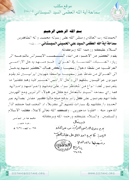 بيان صادر من مكتب سماحة السيد السيستاني -دام ظلّه - في النجف الأشرف حول التطورات الأمنية الأخيرة في محافظة نينوى