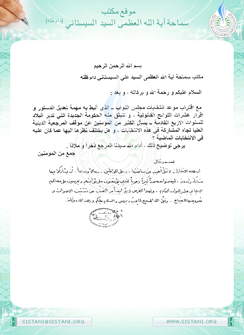 إنّ هذه الانتخابات لا تقلّ أهمية عن سابقتها، وعلى المواطنين _ رجالاً ونساءاً _ أن يشاركوا فيها مشاركة واسعة، ليضمنوا حضوراً كبيراً وقوياً للذين يؤتمنون على ثوابتهم ويحرصون على مصالحهم العليا في مجلس النواب القادم، ولهذا الغرض لا بدّ أيضاً من التجنّب عن تشتيت الأصوات و تعريضها للضياع. وفّق الله الجميع لما يحبّ ويرضى والسلام عليكم ورحمة الله وبركاته.