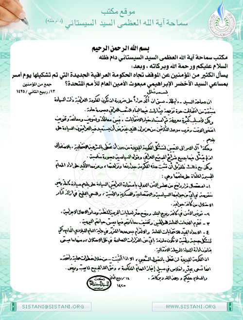 يسأل الكثير من المؤمنين عن الموقف تجاه الحكومة العراقية الجديدة التي تم ّ تشكيلها يوم أمس بمساعي السيد الأخضر الإبراهيمي مبعوث الأمين العام للأمم المتحدة ؟