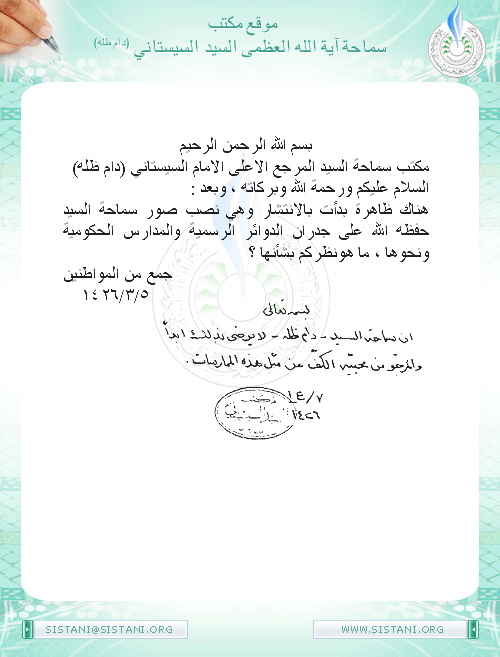 هناك ظاهرة بدأت بالانتشار وهي نصب صور سماحة السيد حفظه الله على جدران الدوائر الرسمية والمدارس الحكومية ونحوها، ما هو نظركم بشأنها؟
