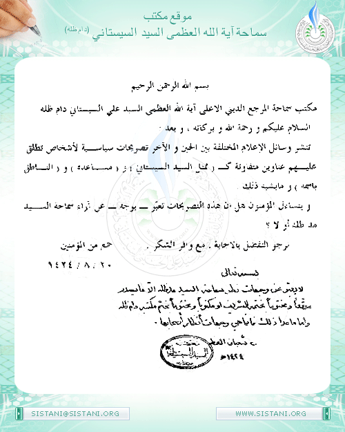 مكتب سماحة المرجع الديني الأعلى آية الله العظمى السيد علي السيستاني دام ظله السلام عليكم ورحمة الله وبركاته ، وبعد :