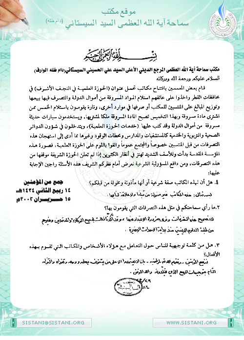 مكتب سماحة آية الله العظمى المرجع الديني الأعلى السيد علي الحسيني السيستاني ( دام ظله الوارف ) السلام عليكم ورحمة الله وبركاته .