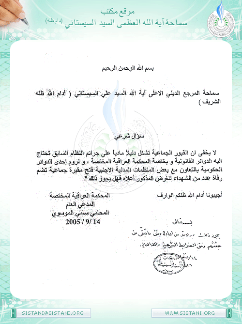 لا يخفى أنّ القبور الجماعية تشكل دليلاً مادياً على جرائم النظام السابق تحتاج إليه الدوائر القانونية وبخاصة المحكمة العراقية المختصة، وتروم إحدى الدوائر الحكومية بالتعاون مع بعض المنظمات المدنية الأجنبية فتح مقبرة جماعية تضم رفاة عدد من الشهداء للغرض المذكور أعلاه فهل يجوز ذلك؟