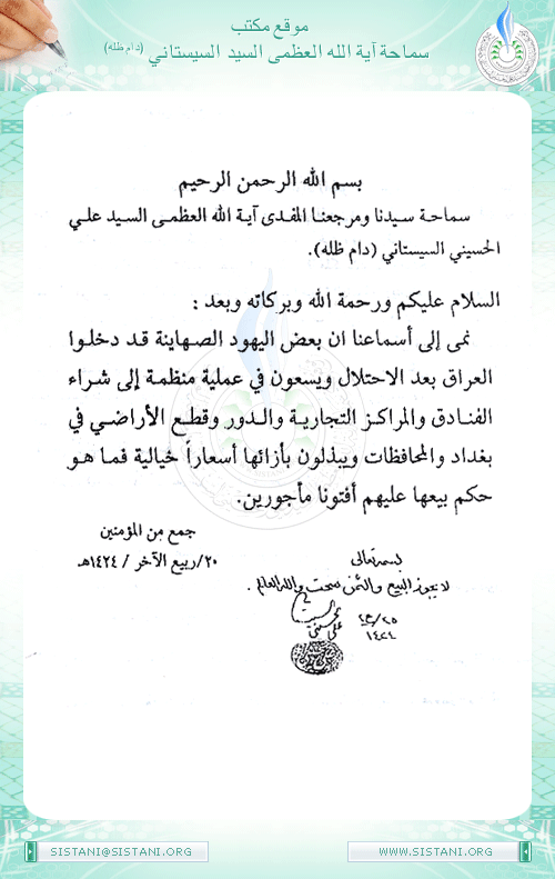 نُمي إلى أسماعنا أن بعض اليهود الصهاينة قد دخلوا العراق بعد الاحتلال ويسعون في عملية منظمة إلى شراء الفنادق والمراكز التجارية والدور وقطع الأراضي في بغداد والمحافظات ويبذلون بأزائها أسعاراً خيالية فما هو حكم بيعها عليهم.