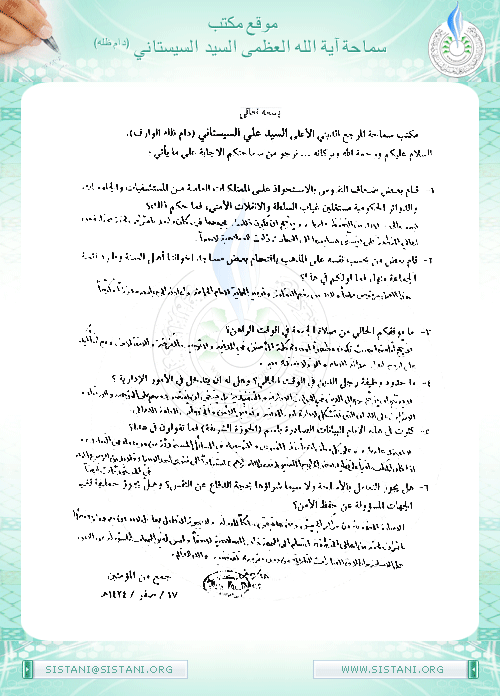 مكتب سماحة المرجع الديني الأعلى السيد علي الحسيني السيستاني (دام ظله الوارف) .
