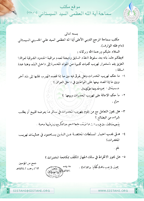 مكتب سماحة المرجع الديني الأعلى آية الله العظمى السيد علي الحسيني السيستاني (دام ظله الوارف) .