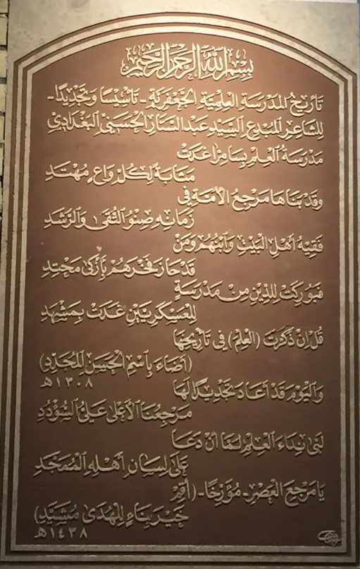 في هذه الايام المباركة ونحن نعيش ذكرى ولادة النبي المصطفى صلى الله عليه وآله وسلم وذكرى ولادة حفيده الامام جعفر بن محمد الصادق عليه السلام يُسعدنا ويَسرنا أن نحتفي بحضوركم الكريم لافتتاح هذا الصرح الرائع وهو (المدرسة العلمية الجعفرية) التي أعيد بناؤها بأمر سيدنا المرجع الديني الأعلى السيد علي الحسيني السيستاني دام ظله.