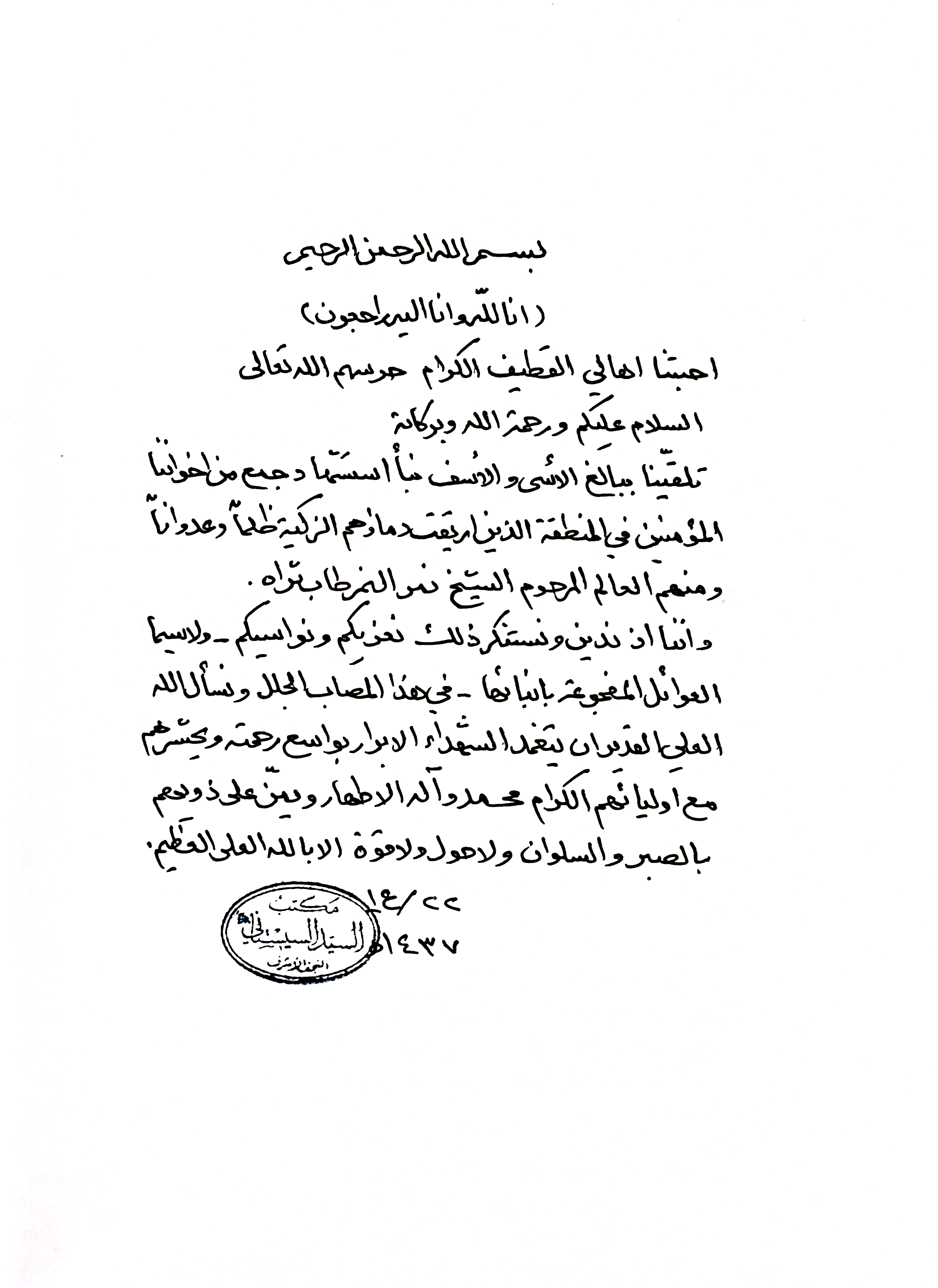 » تعزية مكتب سماحة السيد (دام ظلّه) في إستشهاد جمع من اهالي القطيف