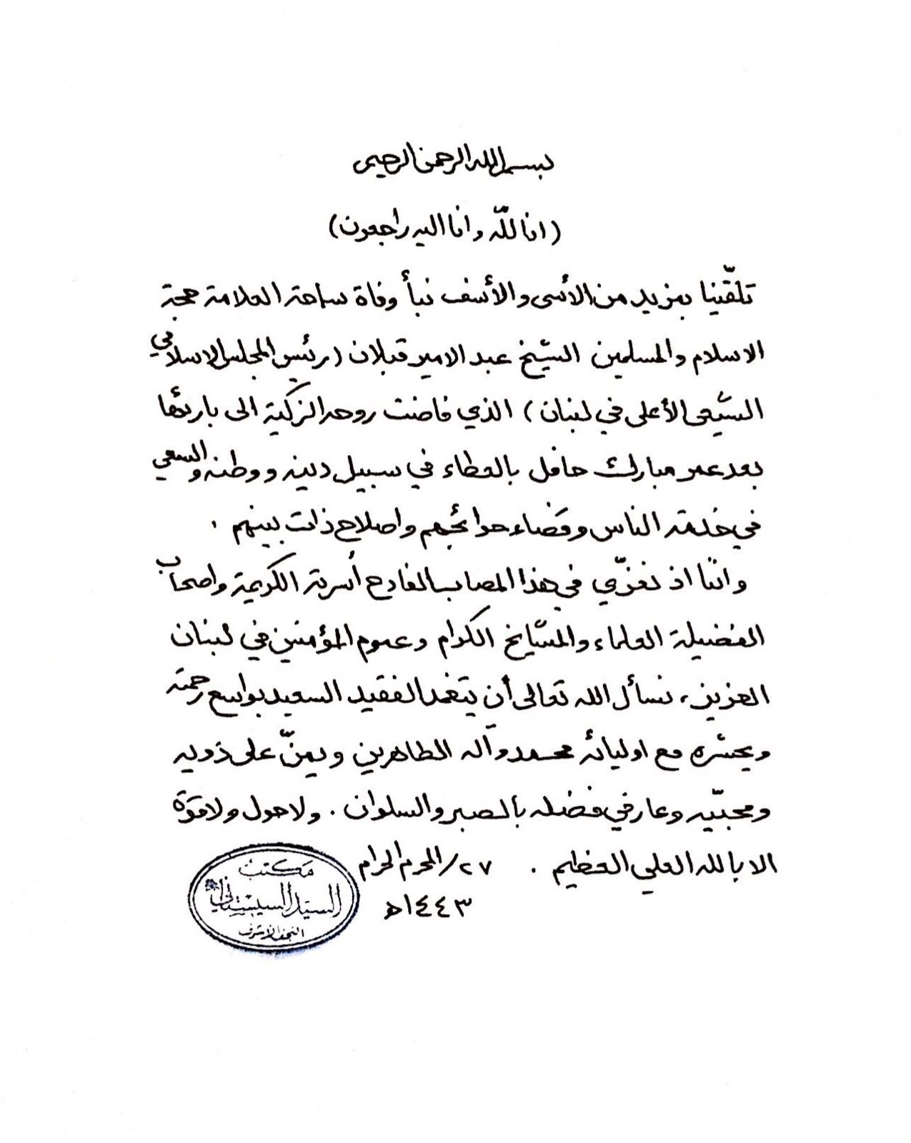 تلقينا بمزيد من الأسى والأسف نبأ وفاة سماحة العلامة حجة الاسلام والمسلمين الشيخ عبد الأمير قبلان (رئيس المجلس الاسلامي الشيعي الأعلى في لبنان) الذي فاضت روحه الزكية الى بارئها بعد عمر مبارك حافل بالعطاء في سبيل دينه ووطنه والسعي في خدمة الناس وقضاء حوائجهم وإصلاح ذات بينهم .